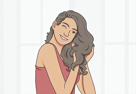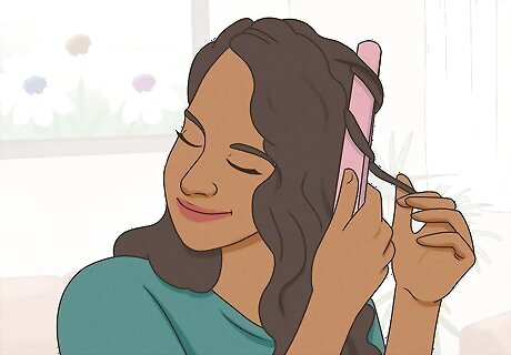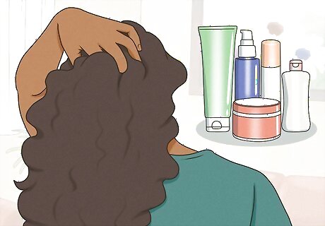 Let your hair air dry and apply a moisturizing product. To avoid damage, let your hair air dry rather than using a blow-dryer, especially if you have curly locks. Apply a moisturizing product like a cream, serum, or oil, then shape your curls as desired. If you have straight hair, simply apply a smoothing product and let your tresses dry on their own. If you do choose to blow-dry your hair, apply a heat-protectant product first. Then, use an ionic ceramic blow-dryer to help combat frizz. Or, use a hooded dryer so the air flows down over the hair shaft. Another alternative is to plop your hair. Wrap it in a soft T-shirt or microfiber towel to enhance your curls while drying.