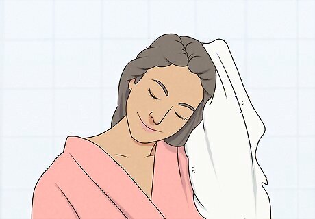 Carefully blot excess water from your hair. Avoid using terrycloth towels to dry your hair, as they have loops that can disturb hair cuticles and contribute to frizz. Try gently pressing the water from your hair with a T-shirt or microfiber towel instead. Remember to never wring or rub your hair aggressively.