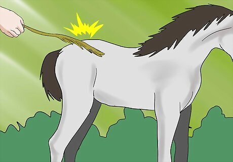 Have your helper give the foal a tap on the rump with their hand, or a small riding crop, and give a small tug on the lead while giving whatever command you want your foal to know means, 'go', such as a kiss, or the simple words, 'walk on'.