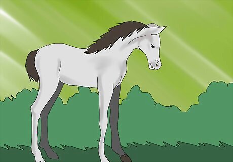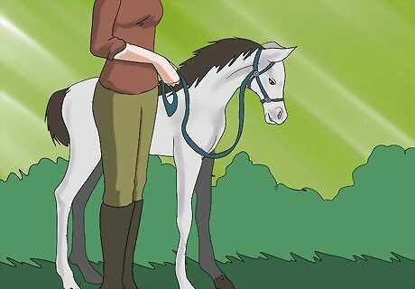 Learn the first haltering lessons. They are around five minutes long each. Walk up to your foal and show him the halter. Let him sniff it and bite it and get totally comfortable with it. Then have someone hold the foal gently while you quickly slip the halter on. You want to do this fast, before the foal learns that he can pull away. When the halter is secure, let him loose and let him run around with it on for a few minutes, keeping him in sight. After about five minutes, walk up to him and have your helper hold the foal while you quickly take it off. Do this every day, increasing the time that he has the halter on, until he will let you take it on and off with no problems.