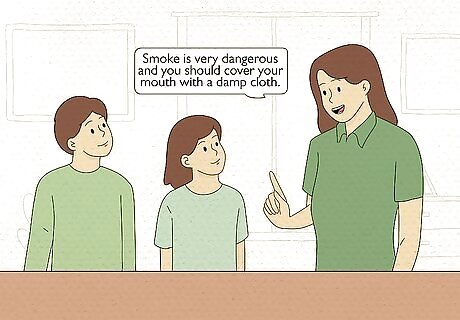 Discuss with your children what to do during a fire. Remember not to be too serious which can frighten them, but serious enough to get your point across. Here are the main points kids should know: Smoke is very dangerous and that they should cover their mouth with a damp cloth. Smoke rises and they should crawl on the floor. Teach them the basic roles of fire extinguishers, smoke alarms, fire ladders, fire hoses and fire blankets. Touch the door, never the doorknob, to see if it is hot. Find another exit if it is hot. Know how to locate a Fire Exit sign and to never travel in an elevator. Enforce the serious danger of matches and how they can injure themselves. When evacuating never stop, not even to make a phone call to Emergency Services and never to go back inside. Stop, drop, and roll if your clothes catch on fire.
