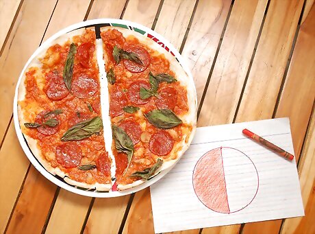 Use a pizza cutter and cut the pizza in half. Ask the child how many pieces there are and reply with, "Each equal piece is now one half". Allow them to draw another circle with a line in the middle from top to bottom. Color half of the circle. Explain that there's two pieces, but one piece is colored––name it "1/2".