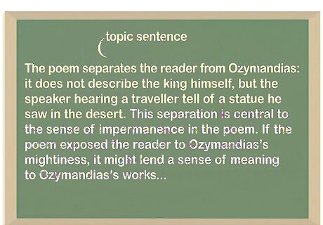 Have your students identify the topic sentence in various sample paragraphs. Hand out a selection of scholarly papers, or photocopy a few passages from a textbook or nonfiction title to look at together. As you read through your example text, instruct your students to circle or underline what they think is the topic sentence in each paragraph. Afterwards, have them explain their reasoning for choosing the sentence that they did. Students who are below a high school reading level will have an easier time with texts containing short, direct sentences that convey simple ideas clearly. If you want to increase the difficulty of this exercise a bit, another option is to scramble the sentences in each paragraph so that they’re out of order and have your students pick the topic sentence out of the disorganized jumble.Tip: History books make great teaching aids for dissecting paragraph structure, as they’re often meticulously organized and tend to proceed in a clear, linear manner.