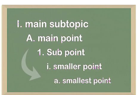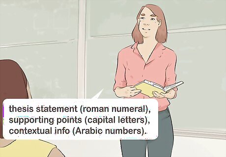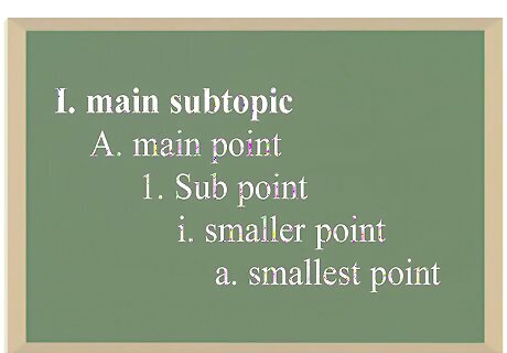 Introduce your students to the standard alphanumeric outline format. Once your students have all chosen a subject for their essays, instruct them to assign a roman numeral to each major topic that they want to cover. Explain that these numerals will go on to become the topic sentences of their developed paragraphs, and that each one will correspond to a distinct section of the essay. To explore key ideas further, have them list individual supporting points beside capital letters on a series of indented lines below each roman numeral. Inform your students that for complex topics, they can also include additional details or examples in regular numbered-list form beneath the relevant supporting point. Make sure they indent every next line to keep track of what information belongs where. Teaching your students to use an alphanumeric outline format will provide them with a simple structure that they can fill in as they begin to expand their ideas.