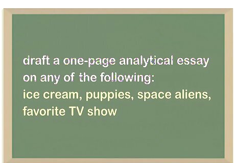 Draft short mock essays on silly subjects. Have your students come up with an outline for a one-page analytical essay on ice cream, puppies, space aliens, their favorite TV series, or another simple and lighthearted topic. Then, give them 15-20 minutes to develop a rough essay from their outline. This will give them the opportunity to practice the skills they’ve been learning in a low-pressure environment. Have your students spend at least 5 minutes planning what they're going to write. Let young students write about their interests in order to keep them motivated. The whole point of writing mock essays is to work quickly and freely, so be sure to tell your students not to stress over their word choice or rack their brains trying to make a compelling argument. Mock essays will be most useful to 5th and 6th grade students who are getting their first taste of essay-writing.
