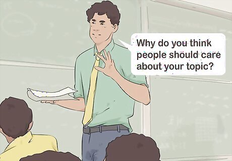 Stress the importance of the initial thesis statement. Give your students a heads-up that they should begin mulling over their thesis statement as soon as they decide on a topic. The thesis statement is the main idea of a piece of writing. It sums up what an essay, article, or scholarly paper is about and serves to introduce the reader to some of the ideas they’ll encounter later on. Remember that there are different types of thesis statements. In an analytical essay, for instance, the thesis statement should express a particular fact about the subject, while in an argumentative essay, it should present a claim or seek to persuade. Prompt your students with helpful preliminary questions to get them thinking about their thesis statement, like, “What do you want to say about this subject?” or, “Why do you think people should care about your topic?”