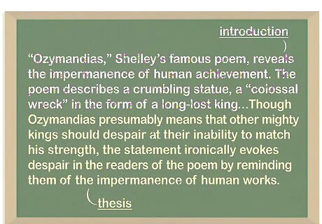 Help your students draft an introduction based around their thesis statement. Once each of them has ironed out a concrete thesis statement, their objective will be to incorporate them into a larger piece of writing. Have them devise a rough opening paragraph that provides an overview of their topic of choice and builds to a summary of the point they want to make, or the main idea behind their thesis statement. Encourage your students to ease into the writing process by starting with general information before working their way up to more specific ideas. If the thesis statement of an essay is, “Pollution is bad for the environment,” the introduction might open with a definition of pollution and go on to describe some of the common forms it takes.