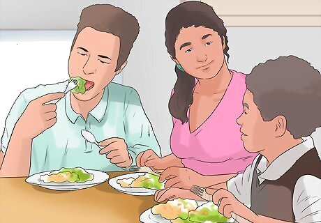 Praise your child for healthy eating and lifestyle choices. If you see your child making good food decisions such as finishing their healthy dinner or skipping a sugary snack, you should offer praise. Encourage them to continue making wise food choices. For example, if you see your child make a healthy salad for lunch, you might say: “That looks both healthy and delicious. It is great to see you figuring out recipes that work for you. You’ll have to teach me how to make it!”