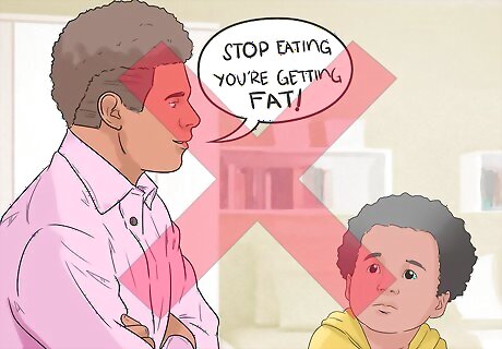 Avoid criticizing your child’s appearance. If you notice your child gaining weight and want to say something, it is best to avoid saying negative things to your child. For example, if you pick your child up from school and you notice their weight in comparison to their peers, try to avoid making negative comments. Avoid saying things like, “Wow, you really have put on some pounds these last few months!” These kinds of negative statements harm your child’s self-esteem.