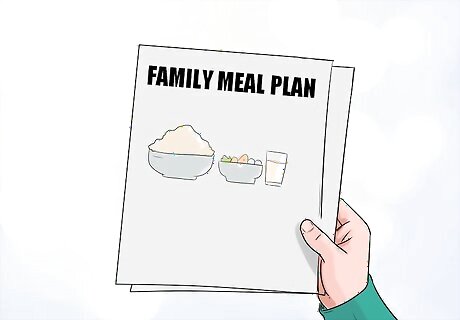 Start a new family meal plan. Prioritize family eating in the home. You should aim for eating fewer calories and reducing unhealthy things like salt and saturated fats. You should also aim to increase the number of fruits and vegetables in your family dinners. Feed your children fruits, vegetables, legumes and whole grains. Children who eat fruits, vegetables, whole grains, and legumes will grow up healthier and live longer. Base your diet on plant foods as opposed to animal products. While you don't want the emphasis to be on animal products, it is still important to include lean proteins in your family's diet. Prepare lean cuts of meat (such as white-meat, skinless poultry) and choose low-fat dairy products. Talk to your doctor or a dietitian if you need help planning a healthy diet for your child and family.