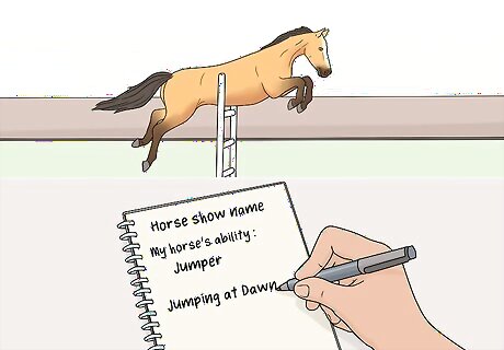 Consider your horse's abilities. If you want to show your horse, then they may have a skill that they are particularly good at, and this could serve as a good source of inspiration for your horse’s show name. If your horse is a jumper, you could call him “Jumping at Dawn.” If your horse prefers classic dressage, you could call her “Just a Classic.” Most race horses have names that are in some way associated with running (e.g. “Bluegrass Stampede”).