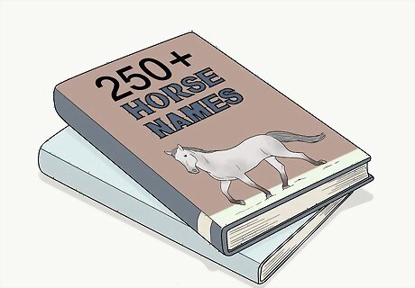 Look at books. You can go to the library and look through name books or you can purchase books, if you want. You might be able to find books that are specific to horse names, but it is not uncommon to give a horse a human name so don’t forget to skim through some baby name books. Don't be afraid to use a unique name that isn't used nowadays. Looking through library books will save you money. Unless you have a lot of horses, you probably will only use the book once, so the library is a good option.