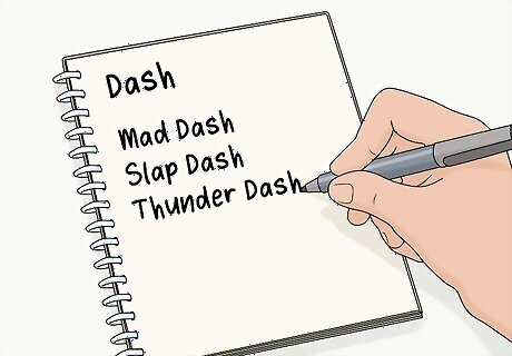 Come up with several variations. You don’t have to choose your horse’s name in one day, so spend time coming up with different variations of your horse’s name. Write them all down no matter how good or bad you think they sound at first. If your horse’s stable name is “Dash” then there are lots of potential show names. For example, “Thunder Dash,” “Slap Dash,” “Mad Dash,” or “Silver Knight.”