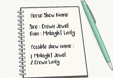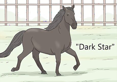 Name them based on the name of the parents. It is quite common to choose your horse’s name based on their lineage. If you have access to the information, look for the names of the dam (the female horse) and the sire (the male horse). See if you can combine the names in an interesting way, or if these names inspire you. For example, if one horse was named “Midnight Lady” and the other was named “Crown Jewel,” you could call your horse “Midnight Jewel” or even “Crown Lady,” if your horse is female.