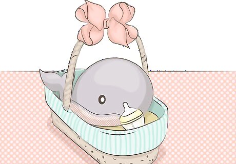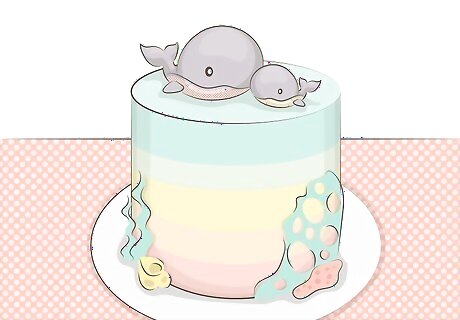Buy or make a cake. Cake is a baby shower staple. Special ordering a cake for a group can be expensive, so baking your own cake or cupcakes from a box mix and canned icing then decorating them with simple colored candy sprinkles or decorative cupcake picks is a less costly option. Display your decorated cupcakes by placing them on a footed cake plate scattered with candy sprinkles and add a cute figurine or rubber ducky in the center. A cheesecake sampler is a good alternative to your standard cake, especially for a small number of guests. These are found in most supermarket bakeries.