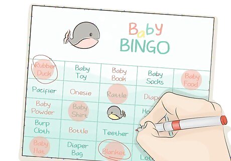 Plan a variety of games. Games are a good way to get the guests involved and break the ice. A mix of active and written games is good. You can create your own written games such as "Unscramble the Baby Words","Match the Baby to the Celebrity Mother", or see how many words you can make out of the mother and father's names. Remember to supply pens or pencils to your guests for written games. Prizes can be inexpensive items such as candles, scented lotions, boxes of candy, cute stationery, gift cards or lottery tickets. Some more active games are "Baby Hot Potato" where you pass a baby doll around a circle while you play a lullaby. Whoever is holding the baby when the music stops is out. Keep going until one person is left. Baby bingo is fun and can be found at most party stores or you can get creative and make your own cards with a computer. This is played like regular bingo except the numbers are replaced with baby related words. For "Diaper a Doll while Blind-folded" all you need is a doll, a diaper and safety pins and a dark blind-fold. "Baby Bottle Drink-off" is a hilarious game." Put about an ounce of punch, water or some other drink in baby bottles and have party participants race to drink their bottle. First person to finish wins. Another really fun game that will be memorable is "Baby Sculptures". Assign each participant a baby related item such as bottle, pacifier, baby's first tooth, or another small item and have them make it out of Playdoh. The person who guesses the most correct sculptures wins.