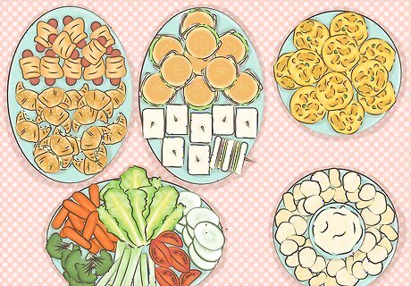 Decide on the menu. Prepare a variety of snacks and desserts for your menu. You could simply have cake and punch or you can prepare a more elaborate spread. If your shower falls during lunch or dinner time you may want to provide a more substantial menu than just dessert. Finger foods are easy to prepare and the choice of finger foods is endless. Pigs-in-a blanket, miniature ham biscuits, mini quiches, assorted finger sandwiches of meat and cheese or chicken/egg salad croissants are always great options. Prepare either a fruit or fresh vegetable tray and serve with a delicious dip. Strawberries and grapes make good fruit selections because they require no cutting up. You can round out your shower menu with small snack items such as chips n dip, snack mix, assorted cubed cheeses and crackers, nuts, mints or whatever else you can think of that your guests would like. If you have a specialty dish or dessert, make it for the shower.