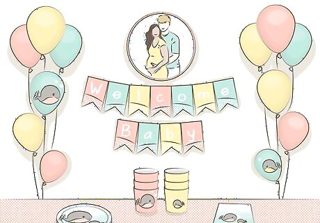 Select a theme for the shower. Choose a character from a fairy tale, children's book, or cartoon. You could also choose baby animals, flowers, butterflies, or another fun, light-hearted theme. Find a party store in your area or search discount stores or the internet for plates, tablecloths, napkins, banners, balloons, favors and so on to match your theme or colors. Decorative plates and napkins look so cute on the refreshment table. Matching the theme to the baby's nursery is a special idea that the mother-to-be will enjoy. If the sex of the baby is unknown, you could do a simple pink and blue theme.