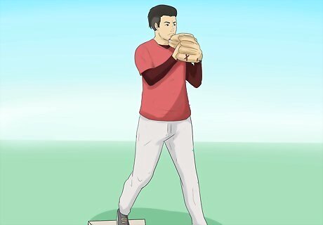 Bring your arm back. A forkball is pitched with basically the same arm action as a regular fastball. The wide finger grip is the main factor in producing the forkball's distinctive action which sees it tail off or drop down right at the last minute. Starting with feet shoulder width apart and facing your catcher, get into your wind-up position. When you're ready to pitch bring your arm back as you would for a split-fingered fastball. Shift your weight a little to your left (for right handers), and pivot your right foot so it is beside the rubber and the outside of your foot is pressing against the mound. Raise your left leg so your thigh is parallel to the ground or higher. As you do this your body will turn to the right to face third base. Bring back your throwing arm, while you hold your left arm in front of you with the elbow bent.