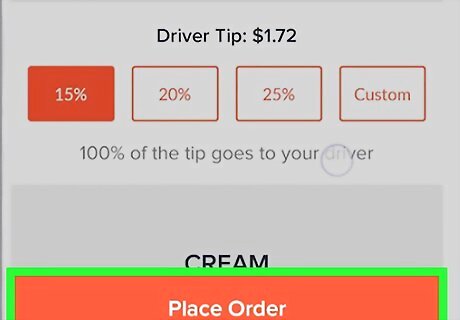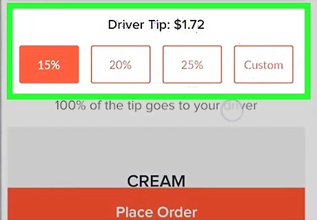 Select or enter a tip amount. DoorDash suggests a tip based on the order’s total (it’s the amount highlighted in red). If you want to change the amount, tap one of the other suggestions, or tap Other to enter a custom amount. DoorDash recommends tipping the service industry standard of about 20%. Your delivery person will receive 100% of the tip, but only a portion of the delivery fee.