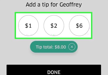 Send a digital tip if you can. Uber now has a way to send tips right through the app, and they advise using it. Rate your ride on the Uber app you have on your phone. Look for the "Add a Tip for (name)" section underneath the button for "Give a compliment". Tap the dollar amount you'd like to apply as a tip to the driver or tap the "Enter Custom Amount." Type in your amount and select "Set Tip", if you've went the Custom Tip route. Tap the "Done" button to save this tip and apply this tip to your driver. You have a 30-day grace period for which to send the driver a tip through Uber's digital form, unlike a paper tip.