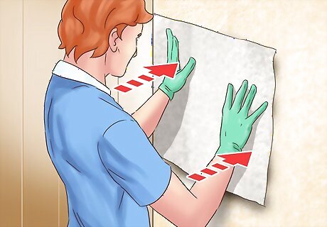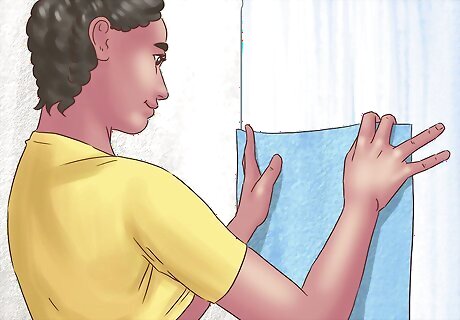 Press the tissue paper onto the wet paint. Spread open a piece of crinkled tissue paper. Line up the side of the tissue paper with the corner where the two walls meet. Line up the top of the tissue paper with the corner where the wall and ceiling meet. Press the tissue paper flat against the wall. Use your hands to flatten out the tissue paper. Don’t worry if there are some small wrinkles and creases.