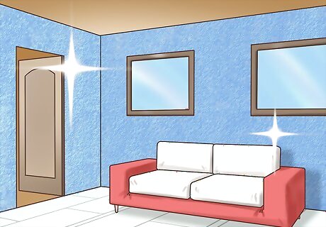 Return furniture and decorations. Give the final coat of paint at least four hours to dry. When that time is up, you can return furniture to the room and rehang pictures, paintings, and switch plates. Latex paint needs about 30 days to cure, or harden fully. You can rehang pictures as soon as the paint is dry, but there may be some stickiness. To avoid this, wait 30 days before rehanging pictures and decorations.