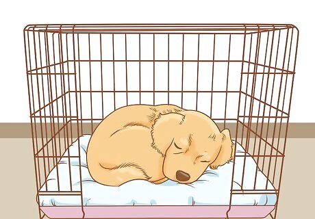 Crate train your dog. Crate training helps establish routine and boundaries for your Golden Retriever. You should put your dog into the crate when it sleeps, when you have company, and when you are gone. This helps reduce accidents, along with other unwanted behaviors like chewing. Make sure you pick a crate big enough for your Golden Retriever. It should be able to comfortably stand and turn around. You will probably need a large crate, for dogs over 70 pounds. Choose one with ventilation on all sides, like a basic wire crate. Golden Retrievers are very social and love being with their families. Place the crate in a common area in your home, not in a room no one uses. This helps your dog still feel like it's part of the family. Never treat the crate like a punishment. It should be your dog’s personal space where it feels comfortable. You should use it to help keep your dog confined when you can’t see it.