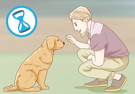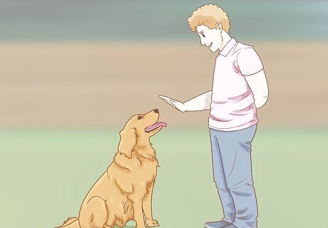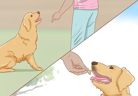 Teach your dog to sit. Teaching your Golden Retriever to sit is important. The sit command is the basis of almost every other command that you teach it. You can use the sit command to enforce basic obedience. Tell your dog to “sit” as you hold a treat over its head. Move the treat back and forth until it sits. You can also push its hind section down to achieve the desired action. As soon as it sits, give it verbal praise and let it eat the treat. Eventually, stop moving your dog and instead use a hand signal or verbal cue. The dog should respond and sit, or learn it with repeated practice.