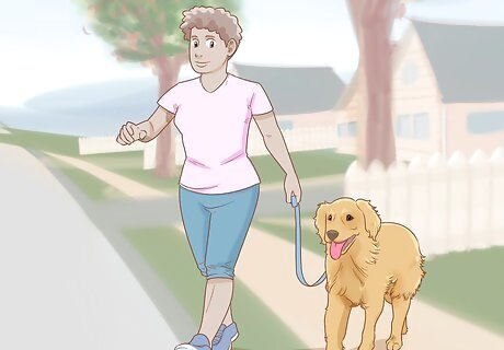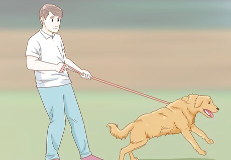 Leash train your Golden Retriever. Golden Retrievers are large dogs, so you don’t want it running around wherever it wants. Work on leash training your dog. Start by taking it for short walks. If it starts to pull on the leash, stop walking and stand there. Don’t move or let the dog go the way it wants. Start walking again when it comes back to you, sit, or let some of the tension from the leash. Reinforce the positive behavior of not pulling on the leash with praise or treats. If your Golden Retriever gets too excited and starts jumping around before you place the leash on it, wait until it calms down to put the leash on it.