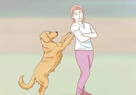Teach your dog not to jump. Your Golden Retriever may have a bad habit of jumping on you. Try using aversion training to discourage the behavior. When the dog jumps, turn your back on it and ignore it. This shows that they will not receive a reward for jumping. When they calm down or sit, turn around and praise it. You may have to turn around multiple times. Another technique you can try is to walk backward and tell your dog "off" or "down." Praise your dog when all of its feet are back on the ground. Try to redirect the Golden Retriever's jumping by using the "sit" command. Jumping can be a hard habit to break. Be sure other family members and guests are also turning their back when your puppy jumps for attention, or your puppy may learn that they get rewarded “sometimes”, making the behavior worse.