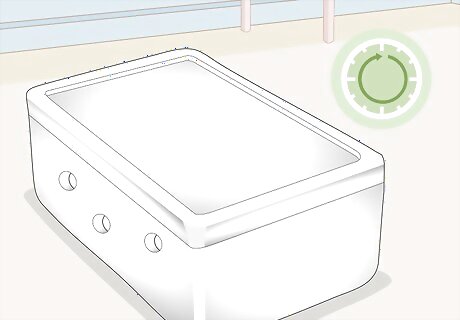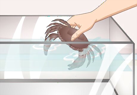 Transfer the crabs to an aerated saltwater tank if you want to keep them alive. If you don’t plan on cooking the crabs right away, fill a large tank that’s safe for crabs with saltwater that has 30–35% salinity. Install an aerator on the tank so there’s oxygen in the water for the crabs. Slowly dip the crabs in the water so they can adjust to the temperature before letting them go in the tank. Maintain the tank at 40–50 °F (4–10 °C) so the crabs can live comfortably until you’re ready to use them. You will need to feed the crabs frozen shrimp or seaweed from a pet supply store in order for them to survive.