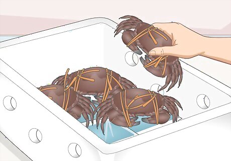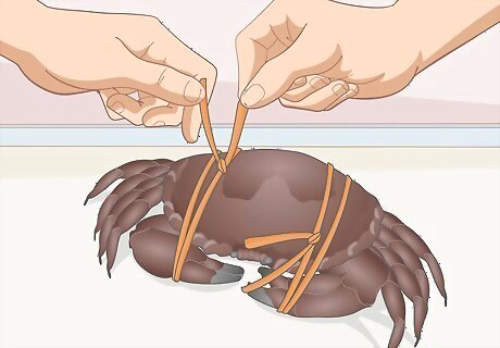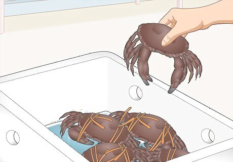 Rinse the crabs with salt water so they don’t bleed out. Cutting between the crabs’ claws can cause them to bleed, but cold water creates a clot and keeps them alive. Put the crabs directly in a tank or livewell with cold salt water and leave them there until you notice the bleeding stops. Leave the crab in the water until you’re ready to tie and pack it so it’s more likely to survive the trip. If a crab doesn’t stop bleeding, then you won’t be able to transport it safely. You can also fill a bottle with salt water and pour it over the claws if you aren’t able to fully submerge them.