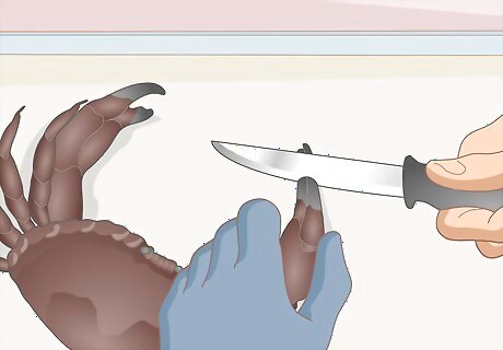 Cut between the crabs’ claws with a sharp knife to prevent pinching. Wrap your nondominant hand around the base of the crab’s claw and hold it tightly so it doesn’t move around. Put the blade of a sharp knife between the pincers and make a ⁄2 in (1.3 cm) cut straight down toward the middle of the claw. Repeat the process on the other claw so the crab can’t use its claws as effectively. This is normally done for brown crabs, but it works with any species. Wear rubber gloves while you’re cutting between the crabs’ claws since they may try to pinch you.Tip: If you have trouble getting the blade between the pincers, use a wedge-shaped piece of metal, also known as a nicking bar, to pry and hold them open.