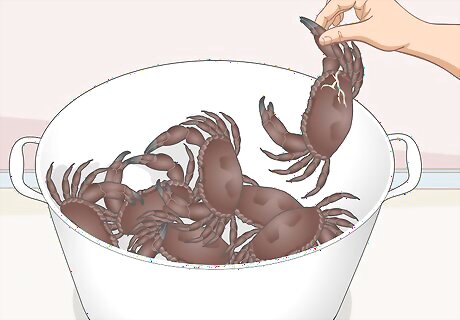 Remove any crabs that have died or gotten damaged during transport. Open the cooler and carefully remove the crabs one at a time. Look for crabs that have lost limbs, look limp, or give off a foul odor and throw them away as soon as possible. Don’t leave any crabs that have died in the container since they could affect the other crabs. Never cook crabs if you don’t know when they died since they’re more likely to cause food poisoning.