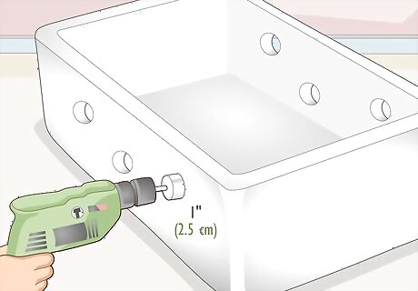 Make 3–4 holes that are 1 in (2.5 cm) on the sides of a foam cooler. Get a foam cooler that’s large enough to hold all of your crabs, which will depend on the species and sizes you have. Draw 3–4 dots on each side of the cooler so they’re evenly spaced apart. Use a drill to make holes going through the foam so air can flow through the cooler. Increase the size of the holes with a file or rasp until they’re about 1 inch (2.5 cm) in diameter. You can buy foam coolers at many outdoor supply or hardware stores. Avoid using coolers with hard bodies since they won’t allow air to travel through them. You may also use a wooden box or wicker basket if you don’t want to drill holes in a cooler.
