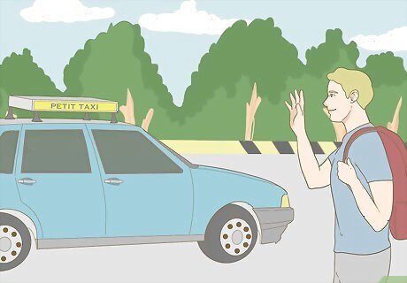 Hail a petit taxi if you want to travel within a city. Petit taxis have a different color depending on where you’re located, such as red in Casablanca and Fes, or blue in Tangier and Rabat. Watch for petit taxis on the road and hail them from the sidewalk so they can pick you up. Make sure the taxi has seatbelts before getting in to ensure you stay safe while they drive. Petit taxis don’t usually have meters, so you may have to negotiate a price for your trip with the driver. Petit taxis can hold up to 3 passengers, and they may not leave until all the seats are taken.