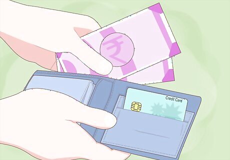 Carry Rupees and a credit card for various purchases throughout your trip; inform your bank that you will travel to India in order to avoid getting your card blocked for suspicious transactions. India uses the Rupee as its national currency, and many bazaars and markets operate on a cash-only basis. You are allowed to bring up to 25.000 Rupees into India. If you do not bring any, be sure to get some cash changed into Rupees at a bank in the arrival area of the airport in India, and only later use an ATM to get a bigger amount, as the exchange-rate at airports is not in your favor. . Most restaurants and official storefronts also accept credit cards like Visa and Mastercard. Always make sure to keep your money close to your body to avoid being pickpocketed, especially in crowded areas.