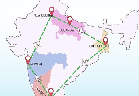 Book a flight in advance to one of the many international airports in India. The airports in India are very busy, and you can often find great deals on tickets if you book in advance. Depending on where you’re flying from, you may have a layover in Europe or Asia before continuing on to India. Consider using aggregate websites like Expedia or SkyScanner to get alerts when ticket prices drop.