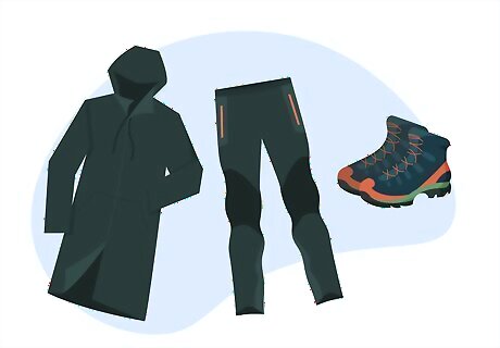 Take a set of waterproof pants, jacket, and boots. Search your closet for water resistant clothes, like a raincoat, waterproof pants, and waterproof hiking boots. Pack at least 1 of each garment in case you run into inclement weather. You’ll be doing a lot of walking in different kinds of weather, so hiking boots are a better option than regular sneakers.