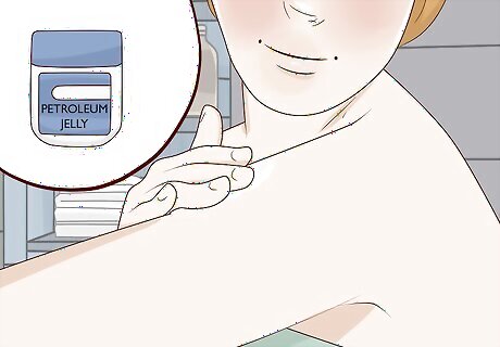 Rub some petroleum jelly into the skin to reduce friction. The main cause of chafing is usually friction. To lubricate your skin, scoop up a chunk of petroleum jelly and rub it directly into your skin. This will keep your skin from rubbing against anything else while you’re out and about. It will also help repair your skin by protecting the pores from irritation. You can use shea butter or coconut oil instead of petroleum jelly if you prefer. You may need to reapply the butter or oil every couple of hours, though. Petroleum jelly is great because it tends to keep skin lubricated for a longer time by trapping moisture in. Petroleum jelly isn’t completely natural, but there isn’t really anything in it that will cause your skin harm. The vast majority of the ingredients are from natural sources, though.