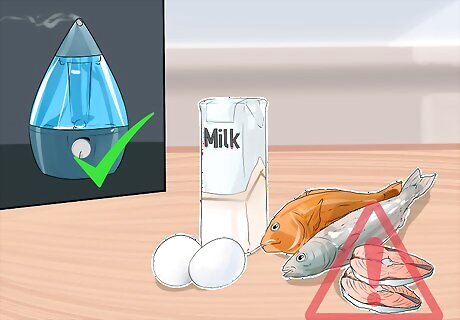 Prevent or moderate future flare-ups. There are some environmental factors that have been known to trigger flare-ups: Milk, eggs, peanut butter, and fish have all been identified as potential trigger foods. Remember, eczema is not an allergy, but it may be exacerbated by them. Dust, dander, and other allergens may also be triggers. Discuss these possibilities with an allergist or your child's physician. Tight clothes or clothes made with rough fibers, like wool, can irritate the skin and cause a reaction. Low humidity can also trigger an outbreak. Use a humidifier in your child's room to keep the skin from drying out. Keep up the bathing and moisturizing routines, even when there are no breakout spots.