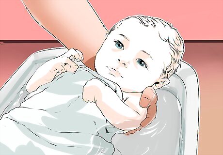 Give your child a daily bath. This routine may help to reduce bacteria that can cause infections and hydrate the skin if done properly. Avoid hot water and overly-long baths, however, both of which can dry the skin. (Dry skin can both trigger eczema and exacerbate outbreaks.) Use lukewarm water and allow the child to soak for only about ten minutes. Wash the child with a mild, non-drying, gentle cleanser. Consider using an emollient, or skin-softening body wash, without perfumes or dyes if the child has especially bad eczema. Wash gently and avoid harsh scrubbing that can make the condition worse. Dove, Cetaphil, and Aveeno are excellent choices for children. Pat the child dry afterwards. Do not scrub the child with a towel.