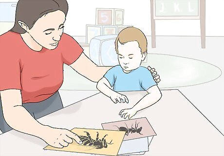 Teach your child to remain calm around bugs and leave them alone. Many insects, especially bees and wasps, won't sting unless provoked. If your child screams or swats at insects that come near them, they might end up getting bitten or stung. Show them how to remain still and quiet if an insect flies near them until it flies off. Show them pictures of wasp nests, beehives, and anthills. Teach them to stay away from these and let you know if they see one so you can take care of it. For example, you might say "If you go near these, the bugs who live there will hurt you. Tell me if you see them so I can take care of them." If you find wasp nests or anthills on your own property, you may want to call an exterminator to remove them.Warning: Do not try to remove a wasp's nest on your own. You are likely to get stung yourself.