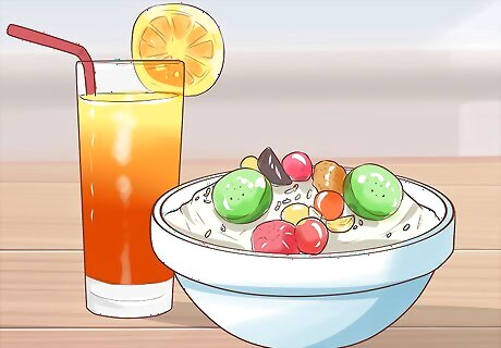 Eat healthy meals and nutritious snacks. Some evidence suggest that MS may cause changes in your immune system that impact your mood. You can combat these changes by making sure you’re doing things to promote your overall health. For example, eat foods that support a healthy immune system and the body’s production of chemicals like dopamine and serotonin that fight depression. Eat plenty of fresh vegetables and fruit. For example, you might add blueberries to your morning oatmeal or have a spinach salad with your dinner. Drink water, flavored water, or decaf tea rather than drinks that are high in sugar, caffeine, or from concentrate. Avoid refined grains and processed foods. For instance, instead of a bologna sandwich on white bread, try a shredded turkey breast wrap using whole grain pita bread. Include proteins, like chicken, nuts, and fish in your daily diet. You might have a handful of almonds as a snack, for example.