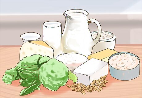 Modify your diet to increase bone health. A diet that supports bone health is a lifestyle change and at-home treatment that can help. Increasing the amount of calcium and vitamin D in your diet helps increase bone health. Add these vital nutrients to your diet. Dairy contains healthy amounts of calcium. Add more milk and cheese products to your diet. Green leafy vegetables contain calcium. Try cabbage, broccoli, spinach, and kale. Soy beans and soy products like tofu contain calcium. Spending 15 to 20 minutes in the sun each day is a great way to get your vitamin D. You may also want to try oily fish, like tuna. Some foods are fortified with calcium and vitamin D, so you can try to look for those. Your doctor may also suggest that you take supplements.