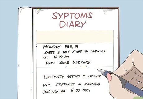 Start a diary of your symptoms. If you start feeling symptoms of a rheumatic disease, especially if you have a family history of rheumatism, start writing down details about the symptoms and when you experience them. Include what you were doing immediately before the onset of symptoms. Your diary will help your rheumatologist diagnose your condition. Symptoms to look out for include joint pain, swelling, or tenderness that persists for at least 6 days or joint stiffness in the morning that lasts for more than 30 minutes. For example, you might write, "Monday, February 17. Knees and hips stiff on waking at 6:00 a.m. Pain while walking. Had difficulty getting in the shower. Pain and stiffness continued through the morning, easing around 11:00 a.m."Tip: Joint pain may also be accompanied by other physical symptoms, such as dry eyes or mouth, increased sensitivity to light, or shortness of breath.