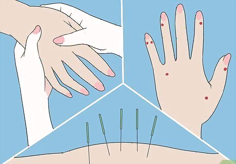 Try complementary therapies to reduce pain. Complementary therapies such as massage, acupuncture, or acupressure may calm your joints and relax tight, sore muscles. These therapies can also help with stress and anxiety. Your rheumatologist might be able to recommend a practitioner who works on others with rheumatic diseases. Look for practitioners who have experience working with rheumatic joints and the pain associated with rheumatism. Your rheumatologist might also refer you to a physical therapist, who can help you with exercises and stretches that will help ease your pain and increase the range of motion of your joints.