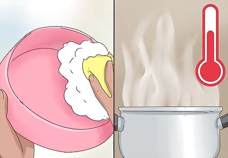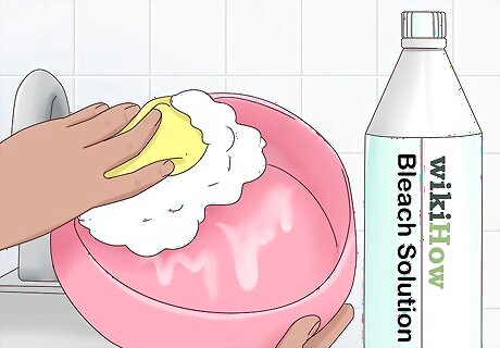 Use sanitized feeding dishes. Use a dish detergent to clean the water and food dishes. You should use boiling hot water to thoroughly disinfect them. A bleach solution can be used periodically, especially after an outbreak. Clean the water and food dishes on a daily basis. Since the infection can be spread through saliva, it's important that the food and water dishes be thoroughly cleaned every day.