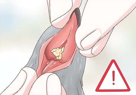 Look for cheesy-looking lesions in the mouth. Open your dove's mouth and take a close look at the lesions. If you see white, yellow, or brown, and cheesy-looking growths in the mouth, your dove may have canker. The growths look like nodules or ulcers at the back of the throat. As a result, your dove may have difficulty swallowing food.